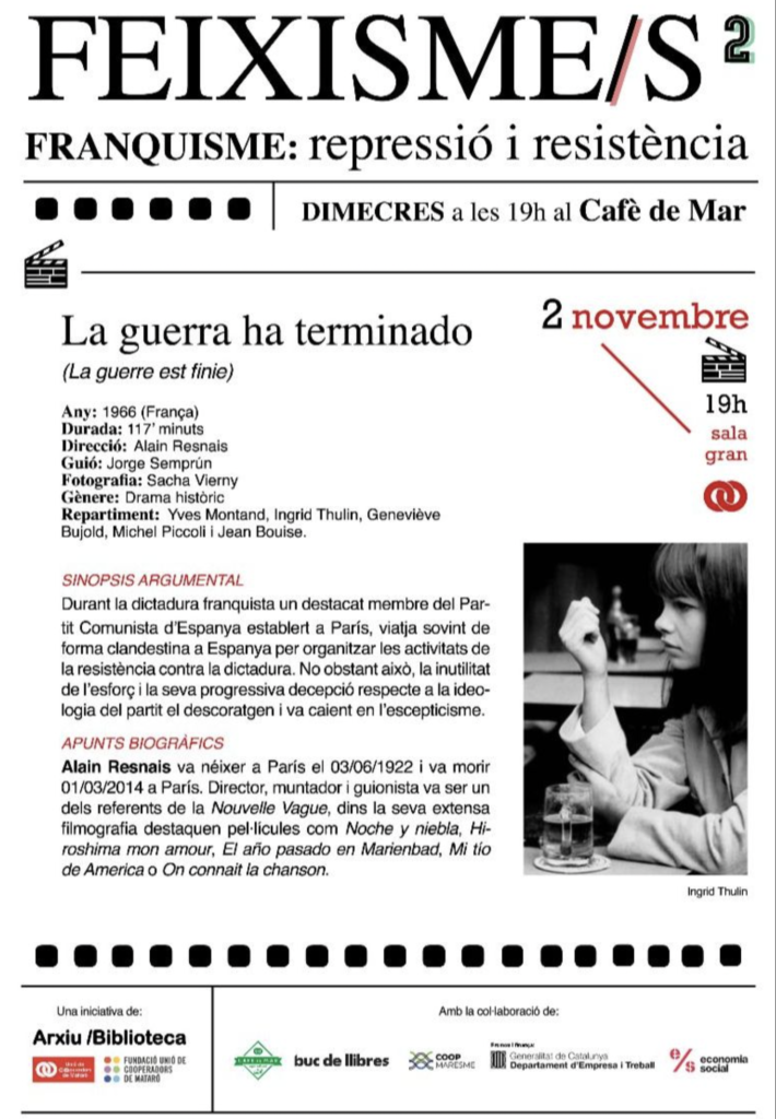 2/11 – Cicle Feixismes 2 – La guerra ha terminado 27 d'octubre de 2022 uniocoopmataro Dimecres 2 de novembre. Pel.licula ” La guerra ha terminado”